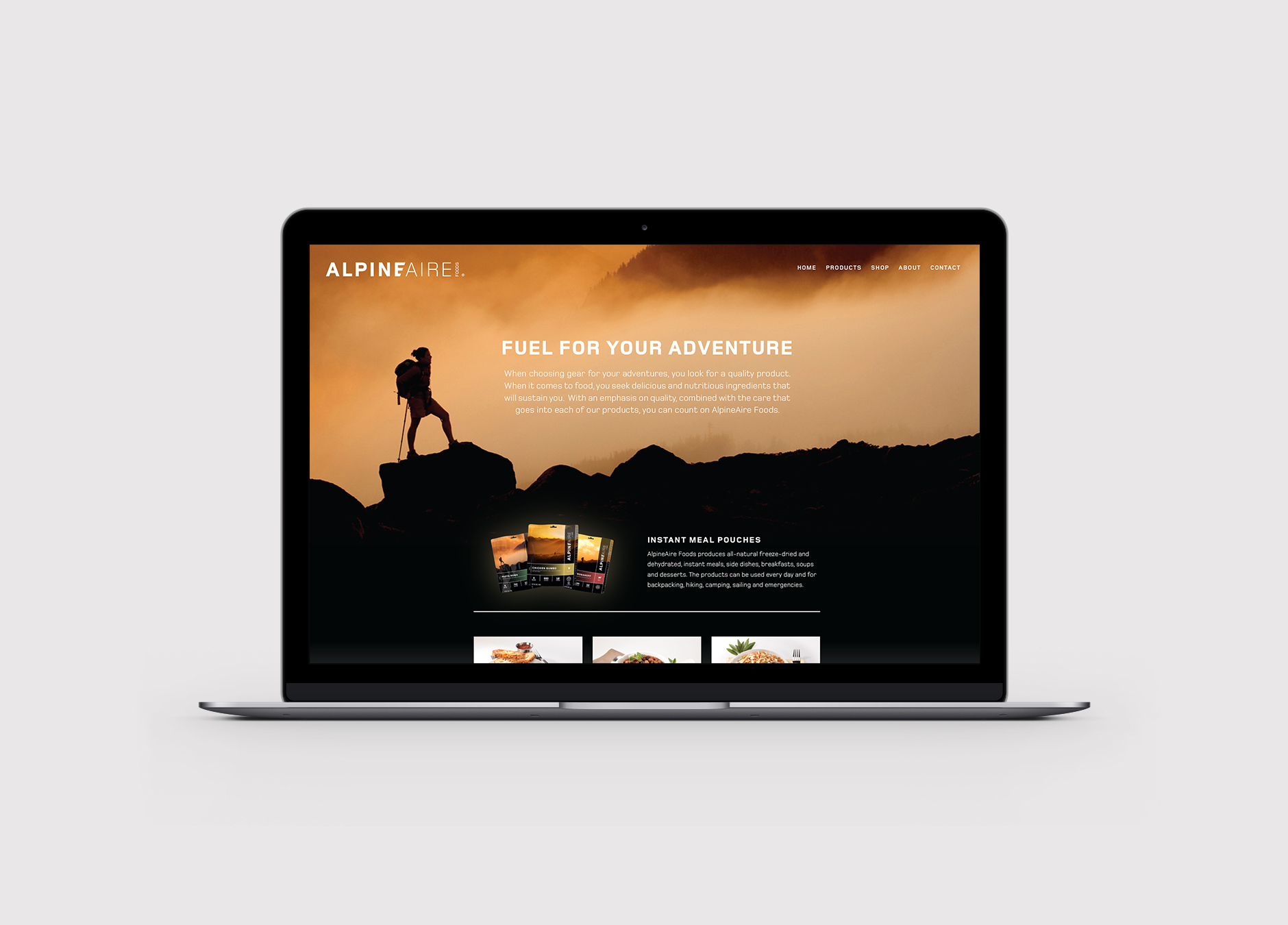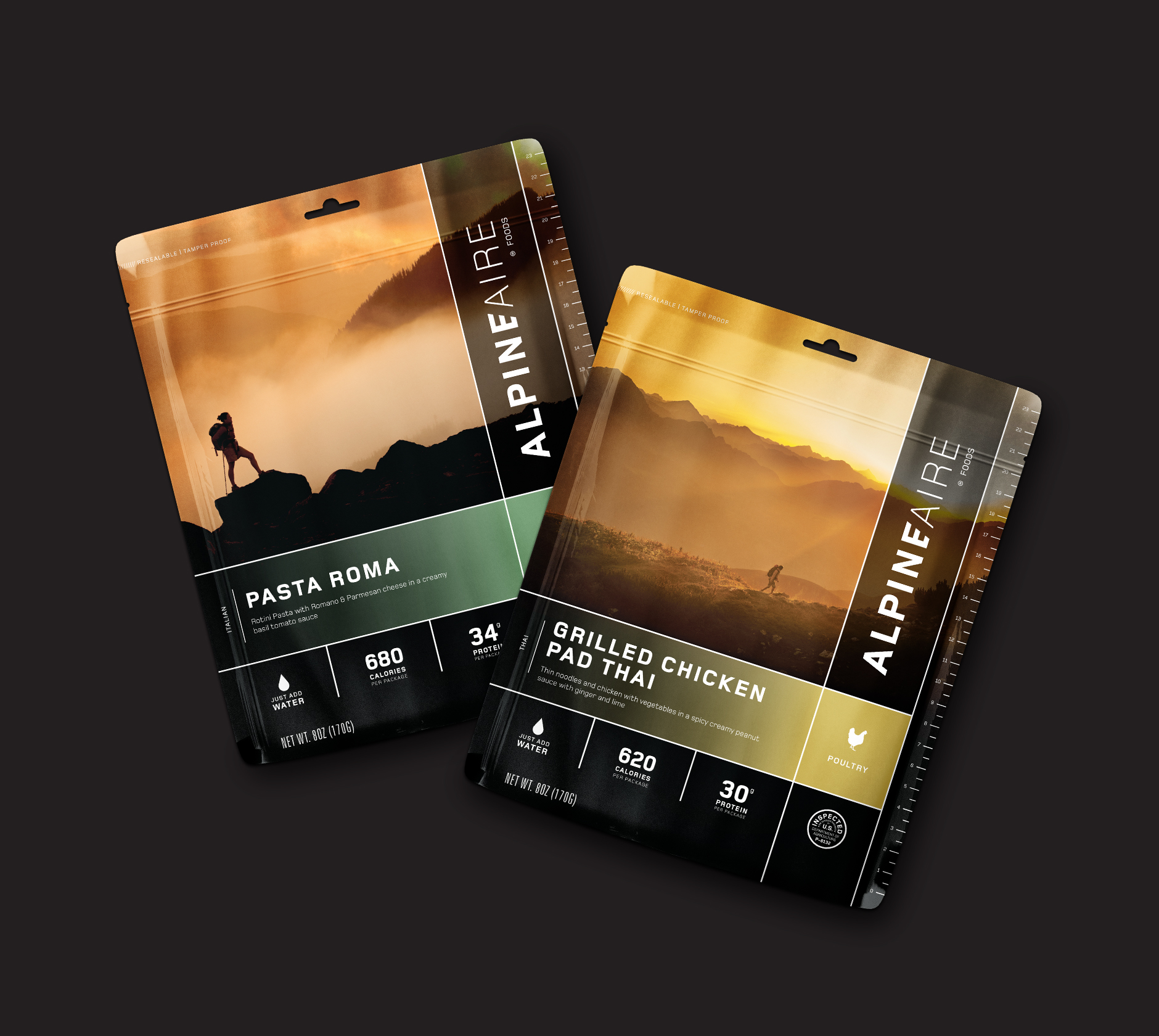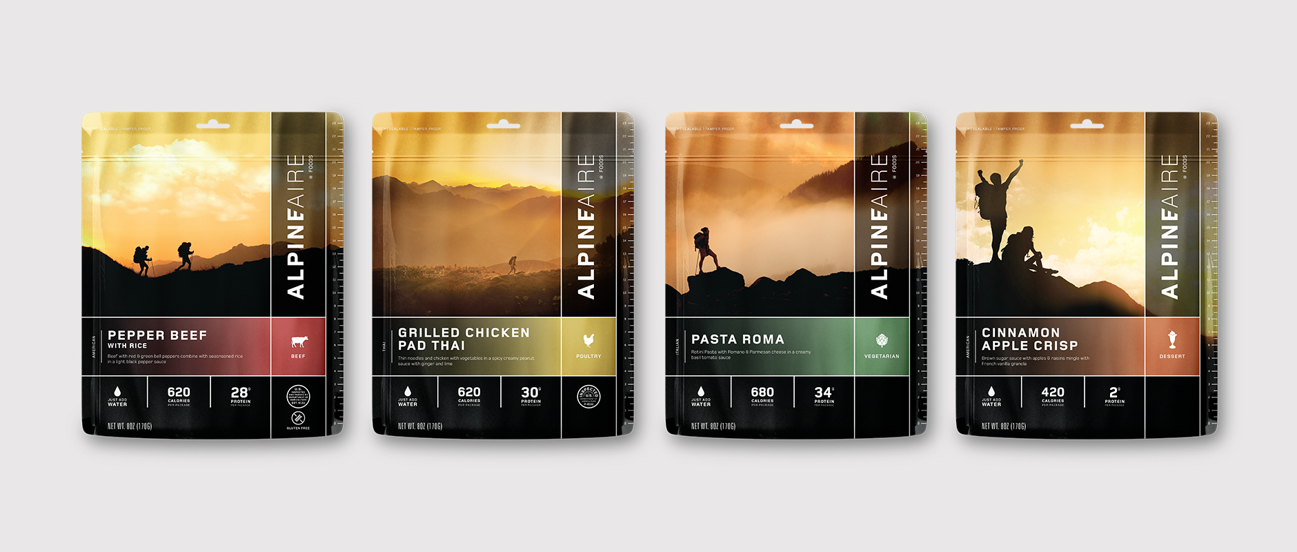 With this rebrand, AlpineAire endeavored to create a package that matched the quality of their product and commitment to the outdoor community. Driven by the concept of ‘Fuel for your Adventure’, the new logo and packaging puts you in the mindset of reaching that summit, taking in the vast beauty of the outdoors, and rewarding yourself with a delicious and nutritious meal.
